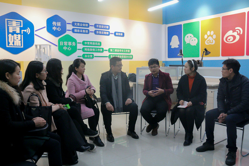 会议伊始,青年新媒体中心曹逸俊同学就中心的概况进行了简要介绍,指导老师梁继航从中心的“五部四室一站”组织结构、“双轨制”运行机制以及微信小组团队建设、制度建设等方面进行了交流。随后,在学校团委副书记陈小波的陪同下,朱锦晟副书记等一行人参观了青年新媒体中心,并就共青团新媒体工作建设、团队建设、制度建设进行了深入交流和探讨。与此同时,两校同学也进行了自由交流,相互学习,共同探讨新媒体工作的方式方法。