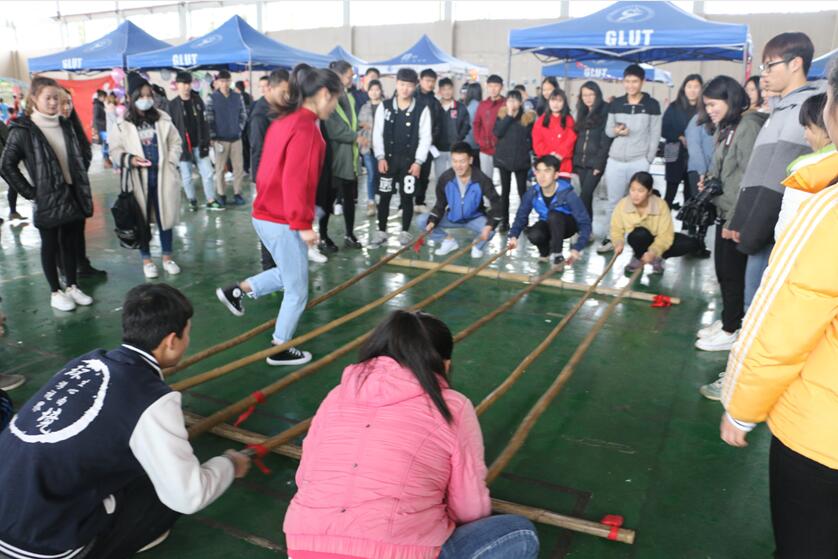 活动现场挂满了用绣球以及中国结装饰的彩带,洋溢着浓浓的民族味,循环播放着的壮族民歌,也使民族节日氛围愈发浓重。当天活动以游园积分形式进行,参与活动的同学也能品尝到传统的美食五色糯米饭,现场精彩不断。游戏脚下生花游戏中需要一人慢骑自行车,当脚落地时另一个人需写出与春天或者传统节日有关的成语,既考验了骑行者的技术,也考察了同学们对传统知识的了解;而30米板鞋竞速接力游戏则需要同学们具有绝佳的默契配合才能使三人同时踩在板鞋上进行竞速接力,因此比赛现场也是精彩纷呈,笑声迭起;而最受同学们欢迎的则是竹竿舞游戏,伴随着竹竿互相敲打拍出的动感节奏,同学们依次以整齐的步伐跳过竹竿,十分考验了同学们的反应能力,现场气氛也是活跃不断。现场还有斗竹马、滚动的童年(滚铁环)、背篓接绣球、花式跳大绳、踢毽子等具有广西民族特色的传统体育竞技活动,让同学们在趣味游玩的同时能了解到壮族文化,在游戏中释放压力,感受民族风情。