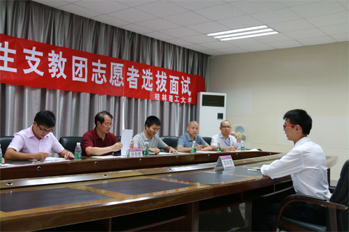 9月24日,太阳集团城网站2017第十八届西部计划研究生支教团志愿者招募选拔面试工作在雁山校区行知楼B301会议室举行。支教团面试评委由校团委、学工处、教务处、招就处等部门负责人担任。