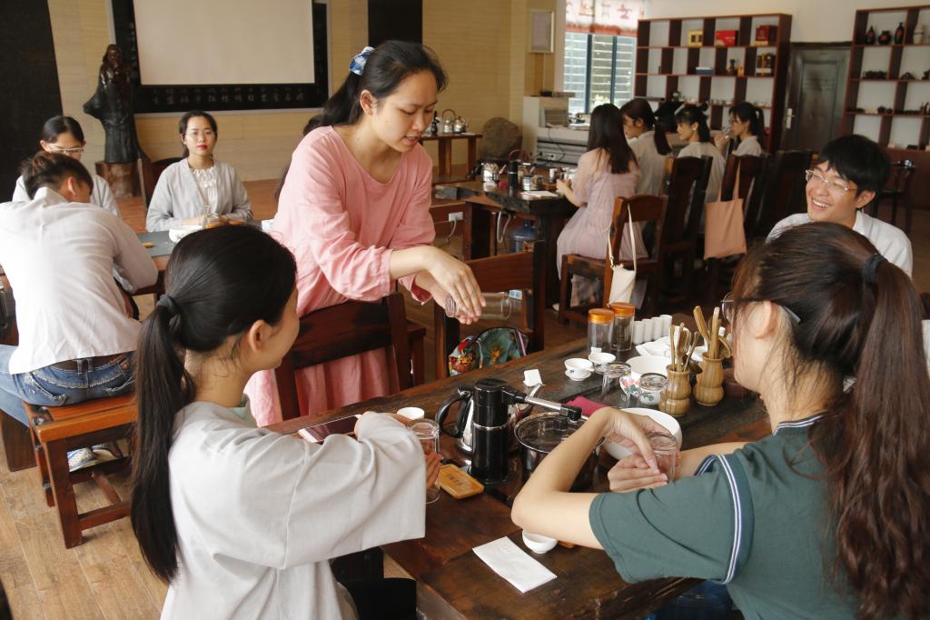 以茶会友,茶韵悠然。5月20日上午,“今学道 致经典” 第一期尚茗学堂茶艺培训班在雁山校区茶艺室顺利开课。由学校大学生创新创业基地企业组织授课培训。