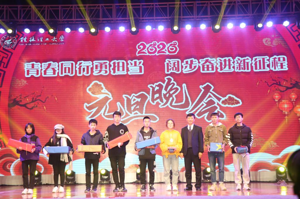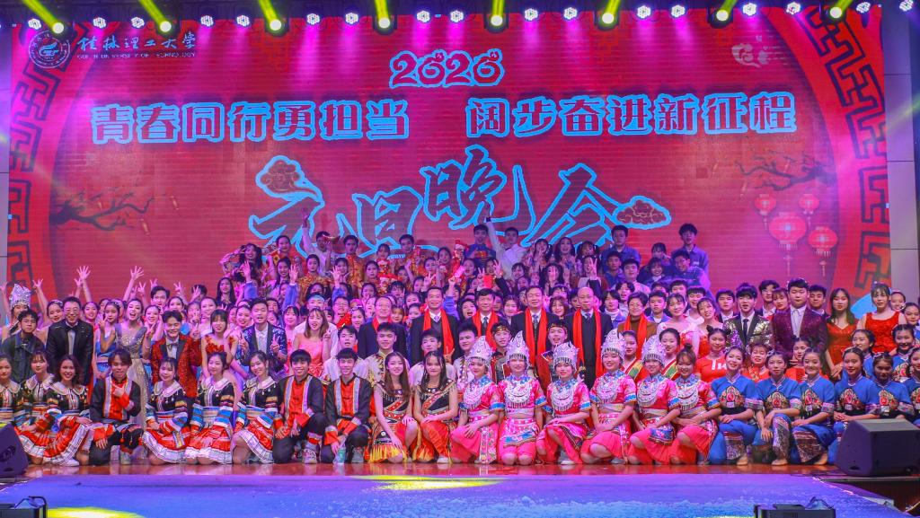“凯歌高奏辞旧岁,一元复始气象新”,在学校第三次党代会圆满闭幕之际,12月31日晚,学校在雁山校区综合体育训练馆举行“青春同行勇担当 阔步奋进新征程”2020年元旦晚会。学校校长解庆林、党委副书记齐俊斌、纪委书记韦学敏,宣传部、学工部、校团委、人文素质教育教学部、体育教学部、保卫处、工会等学校职能部门及二级学院主要负责人出席晚会,与现场师生共庆元旦。