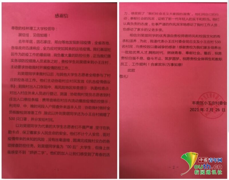 图为丰南区小王庄村委会的感谢信。中国青年网通讯员 刘昊熠 提供