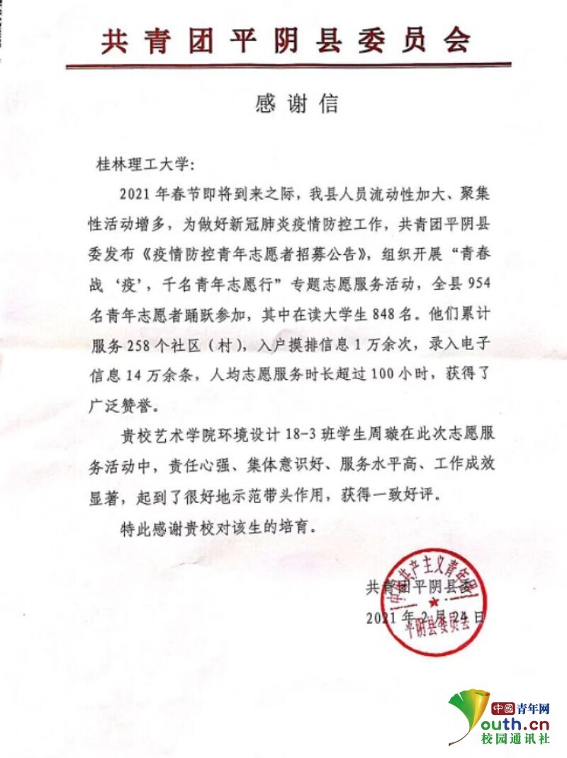 3月11日,周璇意外收到了一封信。这封信由共青团平阴县委所寄,信上有写道:“贵校学生周璇在此次44118太阳成城集团活动中,责任心强、服务水平高、工作成效显著,获得一致好评。”对于这封感谢信,周璇谈道:“没想到会收到这样的一封感谢信。当初选择当志愿者,一方面是为了帮助别人,另一方面是为了锻炼自己。身为学生党员,我要为家乡的防疫工作尽自己的一点力量。这封信我会珍藏起来,因为这是对我的一种肯定和激励!”