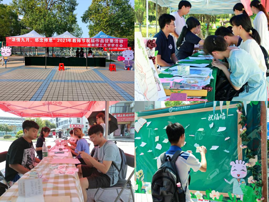 教师节当天,校学生会开展了“浓情九月,感念师恩”教师节祝福作品征集活动,通过以线上线下同步征集、线上投票的形式,最终评选出10件最佳作品。本次大赛共征集百余件作品,于教师节当天在雁山校区一、二号食堂门口和屏风校区三岔路口处设点展示,并将优秀作品赠予老师们,为老师送上教师节暖心的祝福。一件件富有创意的手工艺品、精美的书法和绘画作品,饱含情谊的手写祝福,都充分体现出同学们对老师真诚的祝福和感激之情,以实际行动向老师表达由衷的敬意。此外,校学生会于雁山校区图书馆报告厅开展了教师节观影活动,以观影之名感念师恩,浓厚尊师重教氛围。