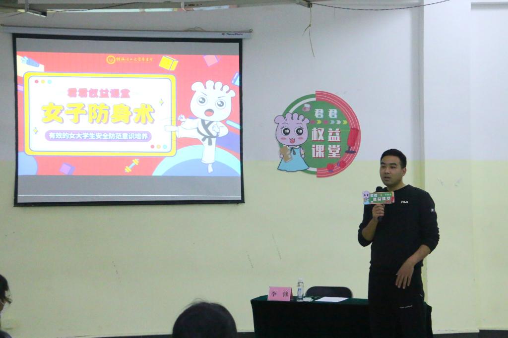 为有效地增强女大学生安全防范意识,提升女大学生的自我保护能力,君君权益课堂《女子防身术:有效的女大学生安全意识培养》于3月22日下午在雁山校区大学生活动中心综合训练室顺利开课,本次君君权益课堂邀请机械与控制工程学院辅导员、散打三级运动员李锋老师担任主讲教师。