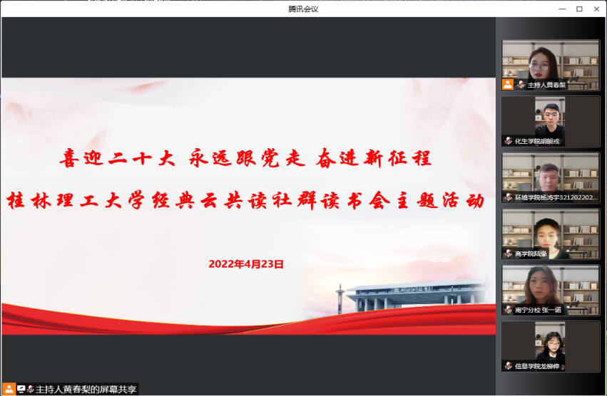 4月23日,是第27个世界读书日。为迎接和学习宣传贯彻党的二十大,同时庆祝中国共青团成立100周年,团结引领广大团员青年坚定跟党走、建功新时代,不断深化学习贯彻习近平新时代中国特色社会主义思想,用党的创新理论武装全团,4月23日上午,太阳集团城网站2017举办“喜迎二十大 永远跟党走 奋进新征程”——经典云共读社群读书会经典共读半小时主题活动。活动通过线上直播的方式进行,共吸引了300余位学生在线观看。