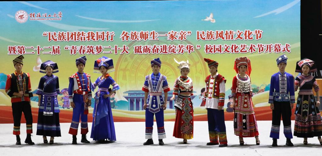 为了传承和弘扬中华优秀传统民族文化,铸牢师生中华民族共同体意识,4月20日晚,在壮族传统节日“三月三”到来之际,学校在雁山校区新体育馆举行“民族团结我同行 各族师生一家亲”民族风情文化节暨第二十二届“青春筑梦二十大 砥砺奋进绽芳华 ”校园文化艺术节开幕式。学校党委统战部、团委相关负责人和二级学院党委副书记、团委书记、辅导员代表、千余名学生参加了此次活动。