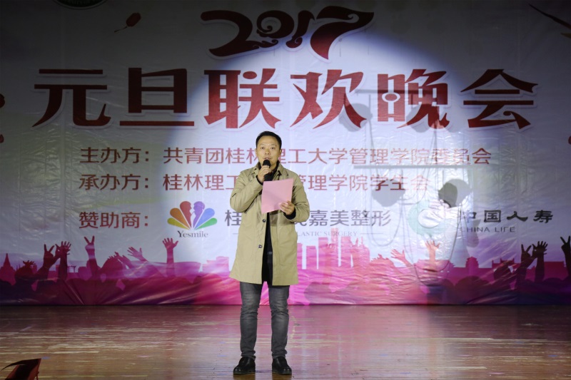 晚会上,南礼堂张灯结彩,观众们欢聚一堂,处处都是新年的欢乐气息。晚会伊始,管理学院党委书记周章明老师为晚会开幕致辞。周书记在致辞中回顾了管理学院2016年在教学科研、学科建设、专业学科竞赛、文体活动等方面取得的累累硕果,同时代表管理学院党委行政对一年来为学院发展建设默默奉献的全体师生表达感谢,最后周书记表达了希望管理学院全体师生在新的一年中同心同德、奋发图强,为学院各项发展建设再创佳绩的美好期待。