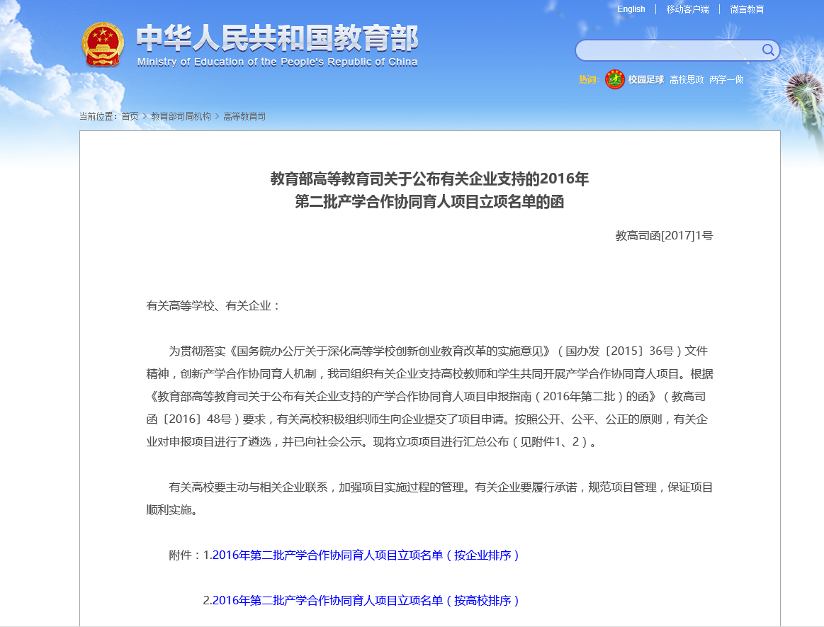 产学合作协同育人项目是教育部高教司为贯彻落实《国务院办公厅太阳集团城网站2017深化高等学校创新创业教育改革的实施意见》(国办发〔2015〕36号)文件精神,创新产学合作协同育人机制,组织有关企业支持高校教师和学生共同开展研究和建设的协同项目,项目旨在深入推进产学合作协同育人,汇聚企业资源,支持高校开展教学内容和课程体系改革、师资培训、实践条件建设、校外实践基地建设、创新创业教育改革和大学生创新创业。