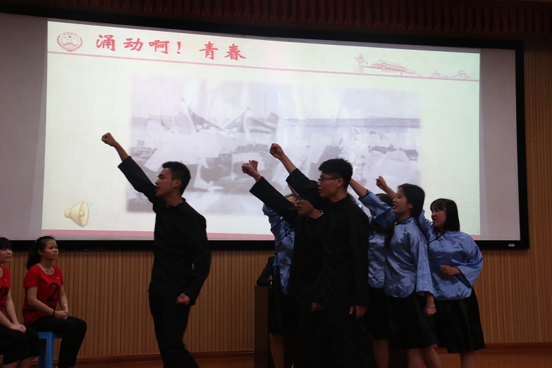随后的舞台剧《涌动啊!青春》再现五四运动时期,行政管理2015-2团支部饰演的青年大学生展现出不畏军阀,力争主权,为挽救民族危亡的展现英勇的精神。而后,全体人员观看了视频《今日中国,如你所愿》,我辈先驱前仆后继奉献青春,历经百年风霜,终换来今日巍巍中华山河,国泰民安之景象。紧接着,谢志萍同学激情饱满做题为《心存感恩,发愤图强》演讲,她说道:“我们青年一代要立志做大事,而不是立志做大官,要始终不忘初心跟党走!”激情的演讲引起现场同学的共鸣。