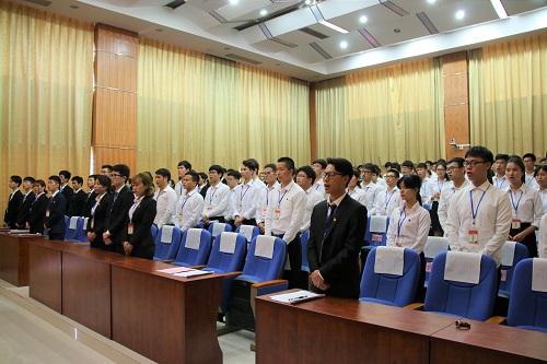 在预备会议的相关审议工作顺利结束后,正式会议在《义勇军进行曲》中拉开了序幕。学院党委副书记陶剑飞上台致开幕词,并在致辞中提出要深化思想认识,紧扣时代发展,强化自身建设和加强组织领导的四点建议。随后由学校团委副书记陈小波代表校团委向大会致贺词,并向各位团学干部提出建议与期望:要牢记使命、坚定信念,志存高远、勇于开拓!紧接着由校学生会副主席杨凡同学致贺词。