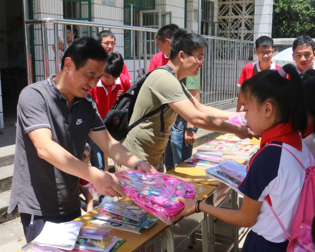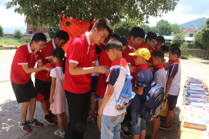 最后,实践队员为孩子们举行了庄重的少先队员入队仪式,希望能让孩子们树立远大的革命理想,坚定自己的学习信念。实践队员把活动前筹集资金买到的书包、图书和笔盒等文具捐赠给13位小学生,希望通过我们微薄的力量去帮助贫困地区的孩子,给他们带去由于教学条件限制而学不到的知识,通过精神上的鼓舞激励贫困地区的孩子们能够更好地学习以改变自己的命运。