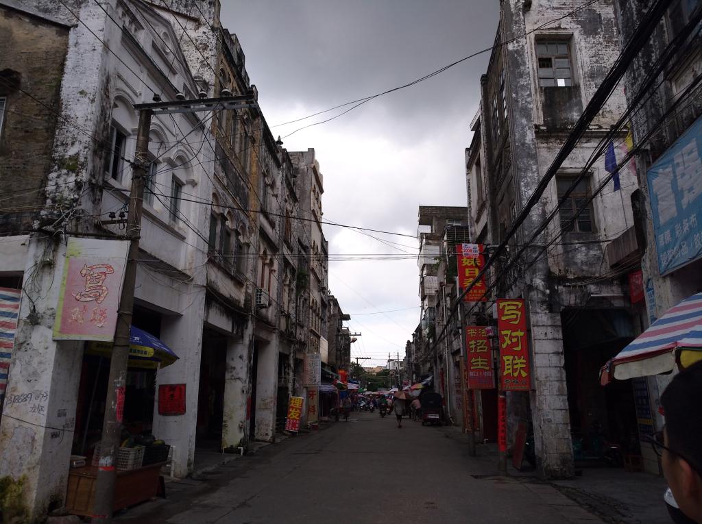 下午,实践团成员穿过半个合浦县城,迷蒙细雨中终于在廉州镇老街上找到我们的下一个考察目标——骑楼。廉州骑楼经过岁月洗礼,已经有些破败,但当地百姓仍然生活在骑楼里,一楼是店铺二楼往上住人。虽然现在这些历史悠远的骑楼已经无法适应现代的居住生活条件要求,但它记载着合浦郡这千年古镇的世事沧桑,我们是否可以运用所学去传承它,让骑楼以另一种全新的方式保留下来,让它焕发新的活力呢?