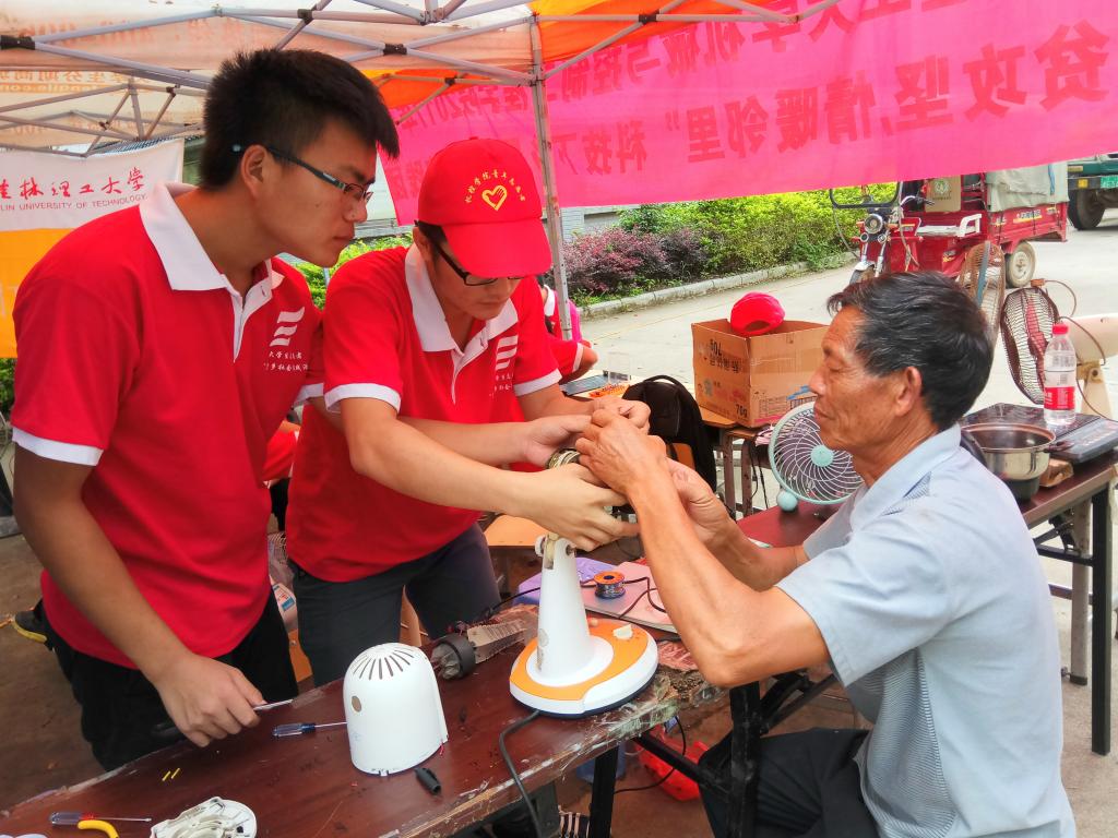 7月9日-13日,太阳集团城网站2017机械与控制工程学院组建“脱贫攻坚,情暖邻里”科技下乡暑期社会实践团,结合学院专业特色,赴桂林市临桂区六塘镇开展社会实践活动,为当地父老乡亲们免费维修家用电器,深入贫困第一线,慰问因病致贫老党员、建档立卡贫困户,还走上田间地头宣传现代农业、科技知识。