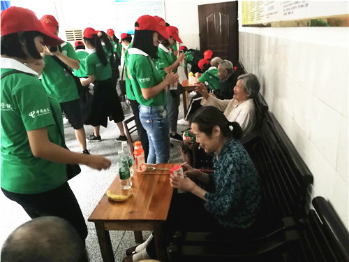活动过程中志愿者们参与了城市清扫活动,以自己的实际行动共建文明社区。随后志愿者们一同来到社区中心,慰问社区内的空巢老人,并给他们送上牛奶、面包和水果。“老吾老,以及人之老”,志愿者们陪爷爷奶奶聊天,简单的问候,关注老人的病情,就足以让他们笑容满面。