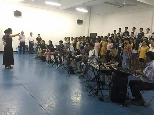 近日,我院统计15级学生刻苦训练,代表雁山区积极备战“迎十九大,感恩祖国”桂林市迎国庆歌咏大赛。9月18日晚,学校校长解庆林、副校长王敦球与雁山区副区长李红等人亲临太阳集团城网站2017雁山校区大学生活动中心训练现场慰问参赛选手和指导老师。