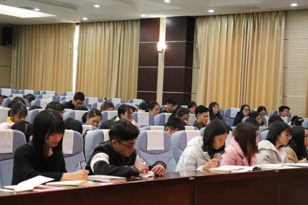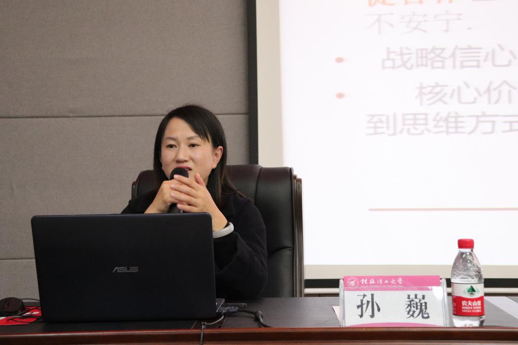 2017年11月22日下午16:00,应商学院团委邀请,理学院党委副书记孙巍老师做客商学院桂工讲坛,在雁山校区逸夫楼报告厅为商学院2017级学生开展了题为《弘扬传统文化,践行社会主义核心价值观》的专题讲座,学院辅导员张雪老师主持讲座。