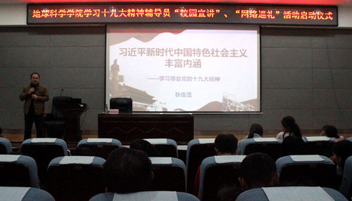 结合《太阳集团城网站2017太阳集团城网站2017学习宣传贯彻党的十九大精神辅导员“校园宣讲”和“网络巡礼”活动方案》的相关部署,为让辅导员和青年学生学在一起,讲在一起,悟在一起,12月19日19:30,太阳集团城网站2017于雁山校区01501报告厅展开学习十九大精神辅导员“校园宣讲”、“网络巡礼”活动启动仪式,并由学院党委副书记耿俊茂进行第一讲。