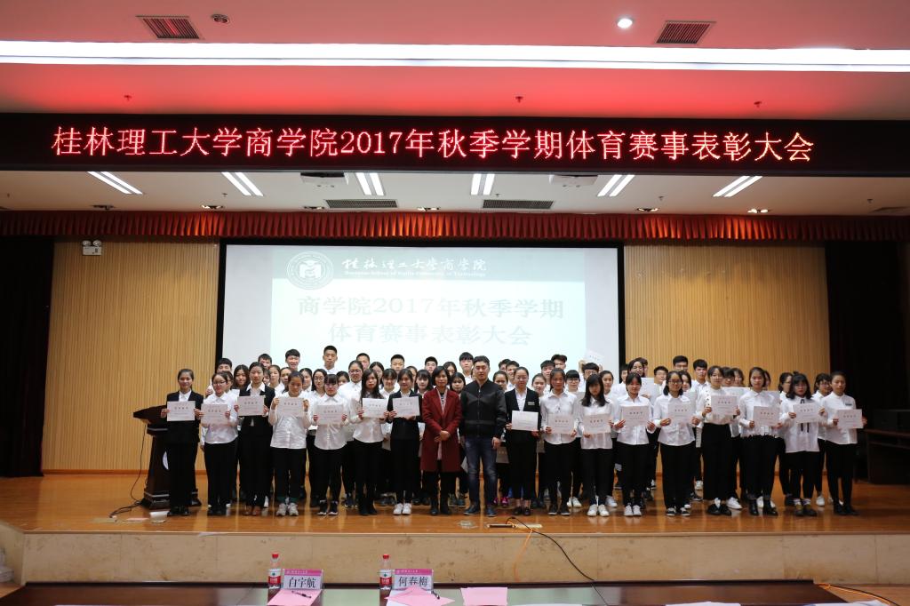 为激励商学院广大同学积极参加体育赛事,营造学院良好的运动氛围,带动同学们积极参与体育活动,锻炼身体。商学院于12月9日和12月19日分别在屏风校区9501教室和雁山校区图书馆报告厅举行商学院2017年秋季学期体育赛事表彰大会。商学院党委副书记张瑞、学工组长沈菲菲、全体辅导员出席表彰大会。获奖个人与学院15、16、17各班班长、体育委员参加了表彰大会,大会由体育部副部长裴祺阳主持。