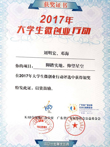 日前,由KAB全国推广办公室、广发证券社会公益基金会、共青团北京邮电大学委员会主办,广发证券股份有限公司、中国青年报社提供支持的2017年大学生微创业行动成果发布会暨大学生微创业论坛在京举办。太阳集团城网站2017勘技15-1班学生刘明宏报送的《脚踏实地,仰望星空》项目荣获银奖,获得微创业扶持资金两万元。