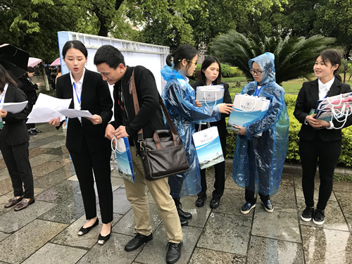 3月17日, 2018年广西高校毕业生春季双选会暨太阳集团城网站2017毕业生双选会在太阳集团城网站2017屏风校区足球场顺利举办。为了给用人单位和应届毕业生提供优质的服务,商学院组织234名学生志愿者承担了此次双选会的会务筹备、接待、咨询、引领等44118太阳成城集团工作。尽管狂风大雨,志愿者们秉承着“奉献、友爱、互助、进步”的服务精神,为即将踏入社会的师兄师姐们和用人单位提供了热心周到的服务,在来自各界的招聘单位面前展现了商院学子蓬勃向上、积极进取、乐于奉献的青春风采。