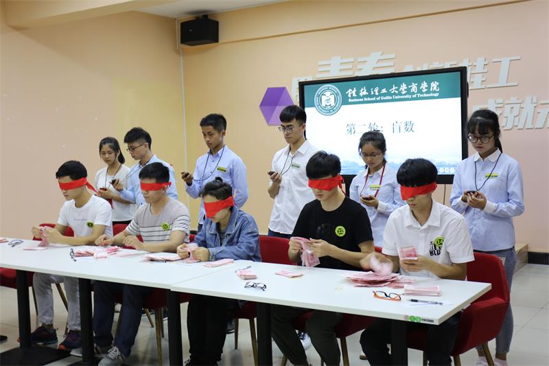 为激发同学们的学习兴趣,锻炼专业技能,展示专业风采,更好地适应二十一世纪对会计应用型人才的要求,以达到商学院“以商促学”的目的,商学院于2018年5月19日晚,在屏风校区7401举办了第八届商学期子活动之点钞大赛决赛。交通银行桂林分行客户经理石海成先生 、会计学教研室罗丽萍老师、杨礼洪老师以及学院辅导员张雪老师出席了本次活动。
