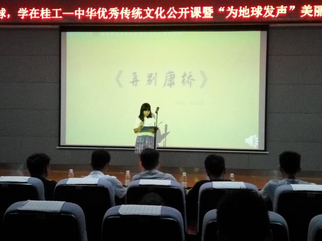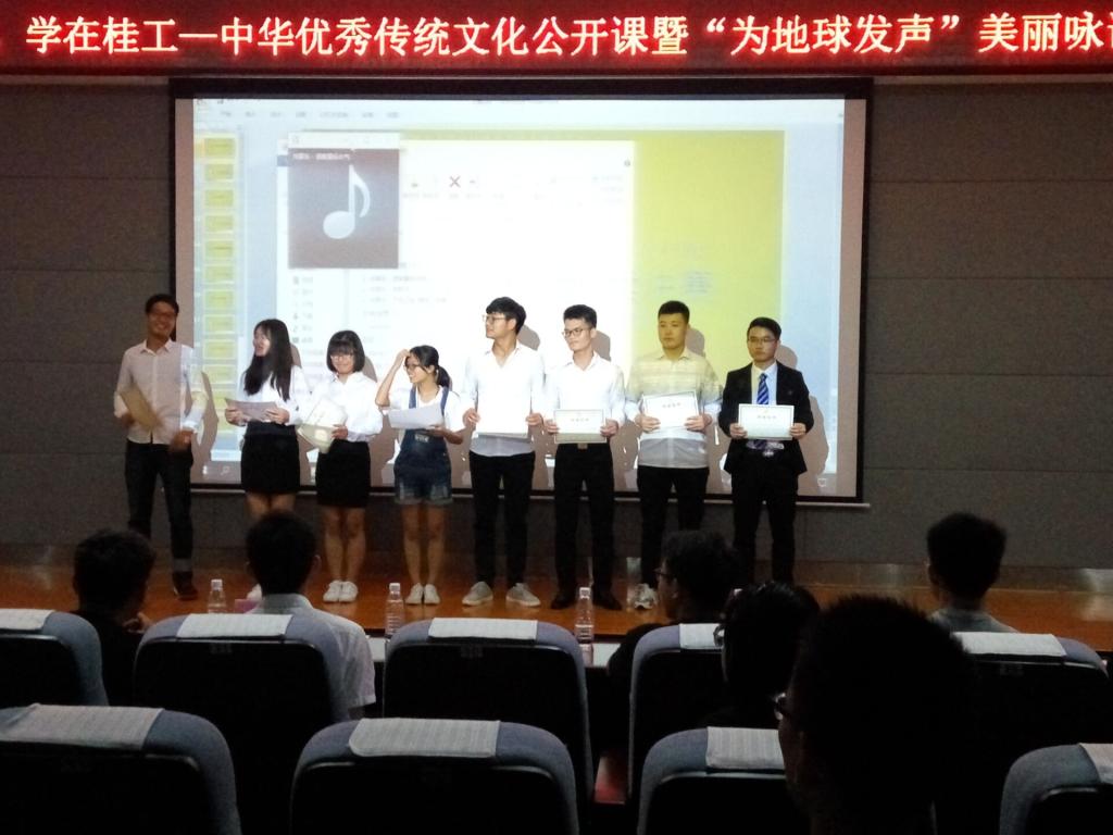 本次大赛作为“绿色地球,学在桂工”系列活动之一,旨在倡导大家“绿色发展、绿色生活”,使同学们的国学素养得以提高,增强同学们的国学热情。