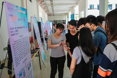 为展示“三全育人”成果,进一步激发学生学习积极性和营造良好学风,信息科学与工程学院2018届优秀毕业设计作品展于6月14日在雁山校区立信楼一楼大厅举办。此次共展出了27件优秀毕业设计作品,作品范围涵盖了算法设计、机器人、手机APP、物联网系统、教学管理、智慧旅游、工业过程监控等十多领域。学校王玫副校长、梁福沛副校长及教务处、学工处、发监中心、校团委等单位负责人及学校共1000多名师生参观了本次展览。