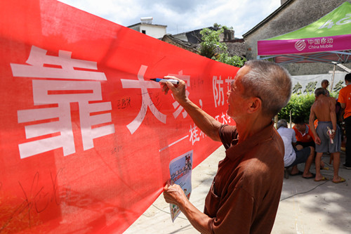 在活动中,同学们将宣传手册分发给村民,并积极向村民们宣传普及毒品的危害以及艾滋病的预防知识。村民们在认真学习宣传手册上面的内容的同时,还认真填写了相关调查问卷。最后,在同学们的引导下村民们纷纷在横幅上签下自己的名字,并表示希望远离毒品,远离艾滋病,要健康幸福的生活。