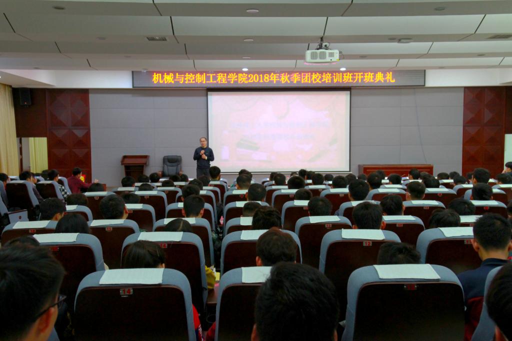 2018年10月24日晚,机械与控制工程学院于一栋报告厅01501召开了2018年秋季团校培训开班典礼,出席本次开班典礼的有院党委副书记耿俊茂,学院团委书记刘颖洁、团委学生会全体学生干部以及各年级班委;学院易班新媒体中心、机器人基地、科技协会、心理协会、扬爱协会等组织学生干部,共计160余人。开班典礼在中国共青团团歌的全体奏唱下召开。