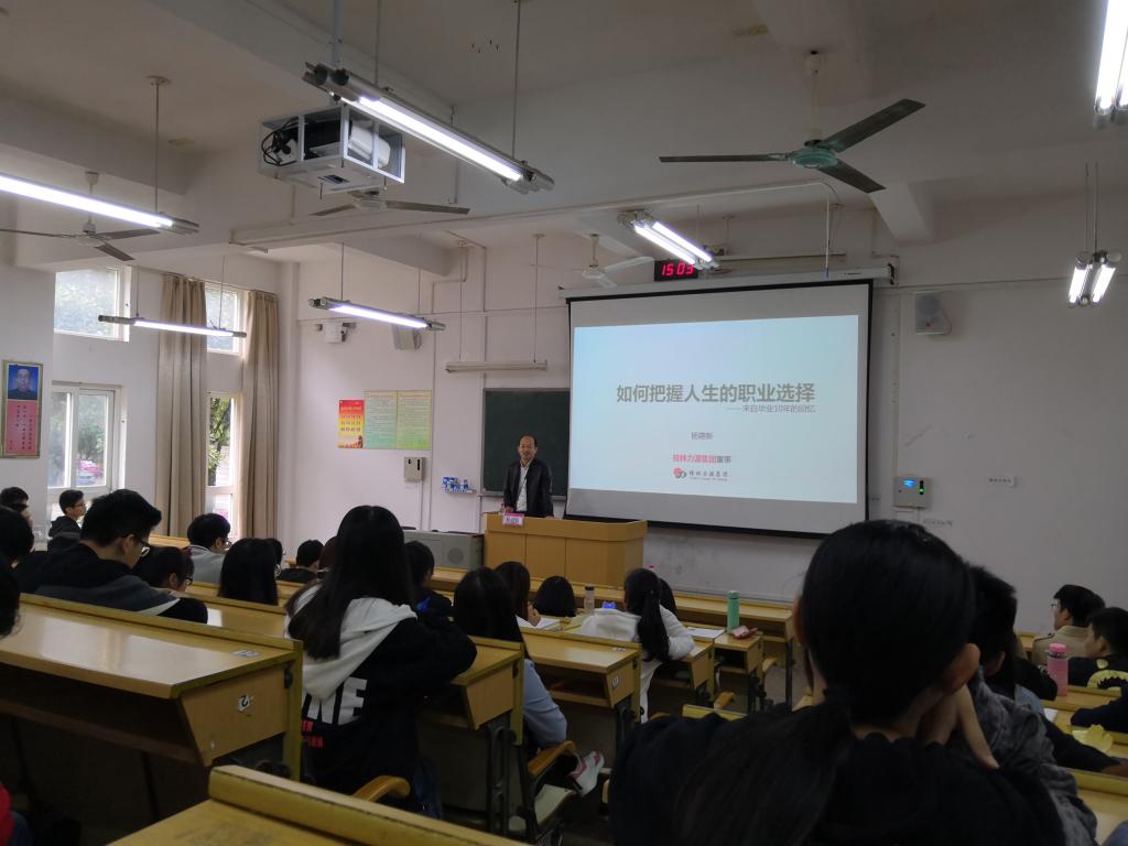 10月23日,商学院邀请桂林力源粮油食品集团董事会董事,太阳集团城网站20172008届毕业生杨建新回校开展题为“如何把握人生的职业选择”的优秀校友系列分享讲座,共有120余名学生参加了讲座,学院学工组长曾丽萍出席并主持了讲座。
