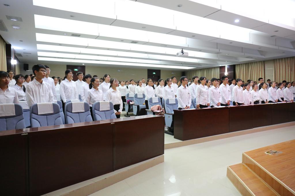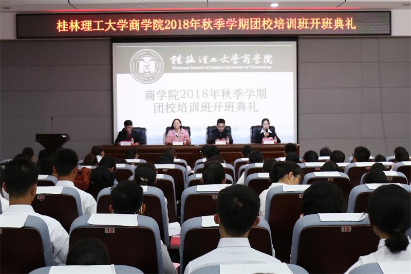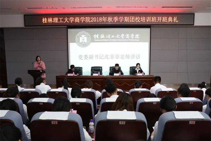 为提高商学院学生干部政治素质和工作能力,帮助18级学生干部又好又快地成长,商学院于11月17日晚在雁山校区逸夫楼报告厅举行2018年秋季学期团校培训开班典礼,商学院党委副书记沈菲菲、团委、学生会指导老师白宇航、学生社区服务管理中心指导老师杨继理出席本次开班典礼。商学院团委、学生会、励合社、易班工作站暨传媒中心、学生社团服务管理中心、博雅人文社2018级成员共184人参加本次开班典礼。开班典礼由商学院学生会主席雷丽钦主持。