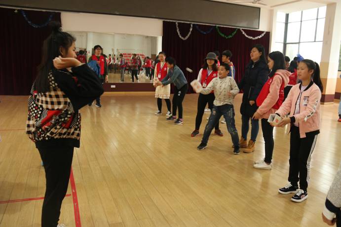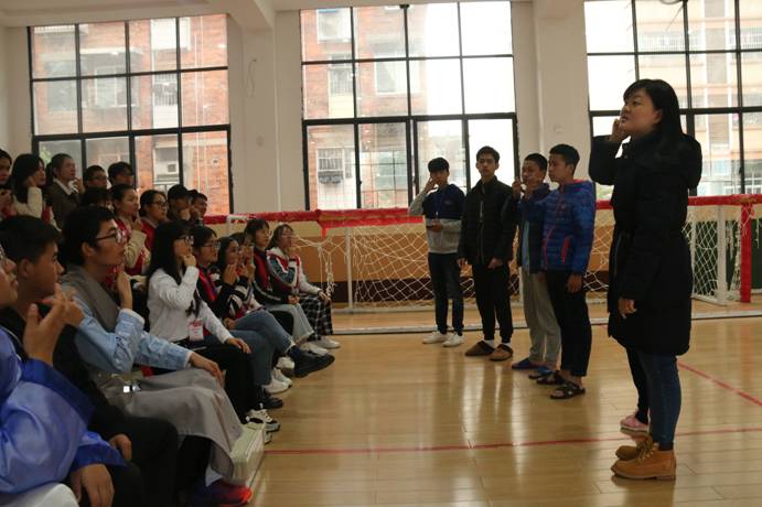 经过一个小时的车程,志愿者们来到桂林市聋哑学校,与孩子们展开了一系列的互动活动。首先,孩子们观看了由国学社成员带来的孔融让梨与悬梁刺股两个小话剧,通过浅显易懂的话剧,让孩子们明白尊老爱幼,发奋图强的道理。接着,志愿者们与孩子们进行了两人三足和投壶的小游戏。游戏的过程中,孩子们积极踊跃地举手参加游戏。快乐、活泼的笑容不断在他们的脸上展现,在拿到糖果后也不忘向志愿者们表示感谢。最后,聋哑学校的老师与四个孩子给志愿者们展示了一节简单的、但包好深意的手语课。看着志愿者们成功地用手语表示出早上好、很高兴见到你们等简短词句,孩子们露出了开心的笑容。