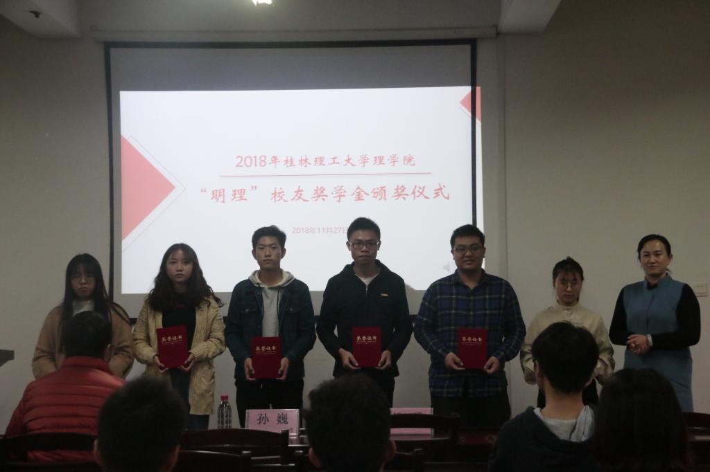 2018年11月27日中午,太阳集团城网站2017理学院在雁山校区07122会议室隆重举行理学院2018年“明理”校友奖学金颁奖仪式。学院党委副书记孙巍老师、学工组组长杨剑老师、2017级辅导员李鹏宇老师、2018级辅导员舒强老师、获奖学生及学生代表参加本次颁奖仪式。仪式由2018级辅导员舒强老师主持。