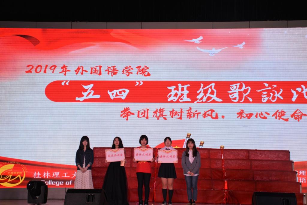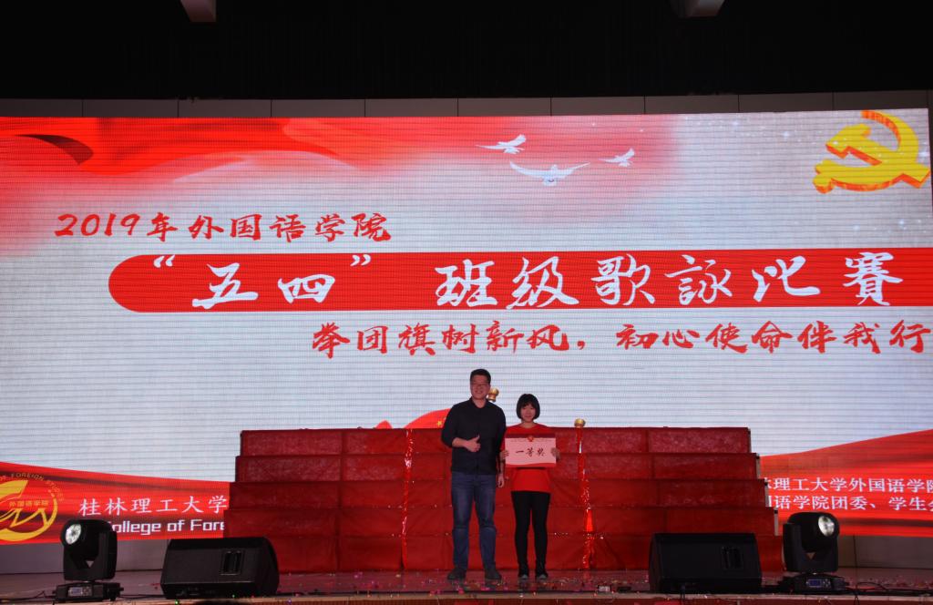 本次比赛以班级为单位,采用抽签的方式决定各班出场顺序。伴随着主持人热情洋溢的开场白和学院艺术团舞蹈队的精彩演出,歌咏比赛在热烈的掌声中拉开帷幕。首先由学院党委副书记邓洁琼致开场词,她激励同学们继承和发扬“五四”精神,增强历史使命感和社会责任感,做有志向的青年一代,并宣布本次歌咏比赛正式开始。比赛中,外国语学院各班级创意百出,表演形式丰富多彩。台上同学们放声高歌,嘹亮的歌声显示了青春的活力,弘扬了伟大的五四精神。台下观众们欢呼不断,掌声雷动,沉浸在欢乐的气氛之中。比赛中还设置了幸运观众有奖问答环节,使得比赛现场的气氛更加活跃。比赛接近尾声,经过一番比拼,日语16-2班荣获一等奖,学院团委书记钟立军为之颁奖;英语17-4班、英语17-2班荣获二等奖,学院辅导员陈欣为之颁奖;英语17-5班、英语16-4班、英语18-2班荣获三等奖,学院辅导员梁天秦为之颁奖;英语17-2班的王黎书书获得最佳指挥奖,日语16-2班和英语17-4班获得精神文明奖,广西师范大学老师卿可青和学院辅导员梁璇为其颁奖。颁奖典礼结束后,本次比赛圆满结束。