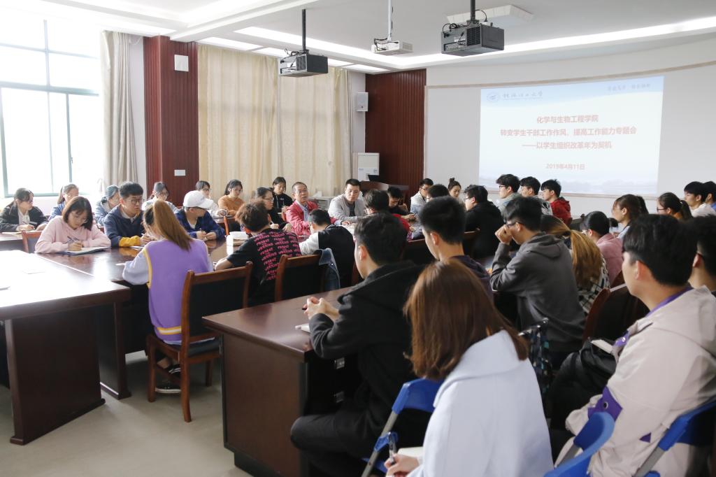 为进一步加强和改进学生组织和学生骨干队伍建设。化生学院以学生组织改革年为契机,2019年4月11日,在12217多功能会议室召开“转变学生干部工作作风,提高工作能力”专题会议。学院党委书记梁军、党委副书记江玲,学生工作办公室全体专兼职辅导员与各组织学生骨干参加了会议。会议由学院党委副书记江玲主持。