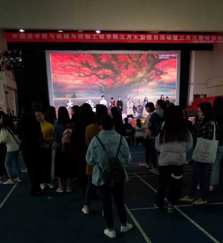 在老师致辞结束后,外国语学院声乐队与消防车乐队共同演唱的歌曲《大鱼》,优美动听的歌声让活动气氛更热烈起来。最后一个表演项目则是两个学院的朗诵队共同朗诵《我的祖国》,随着荡气回肠的朗诵声缓缓,活动表演环节结束,而接着则开放游戏环节供同学们互动赢取精美礼品。