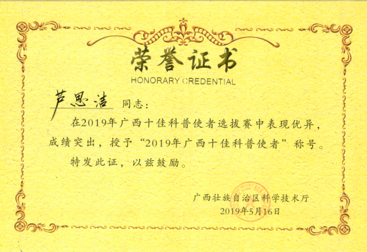 “2019年广西十佳科普使者”称号证书