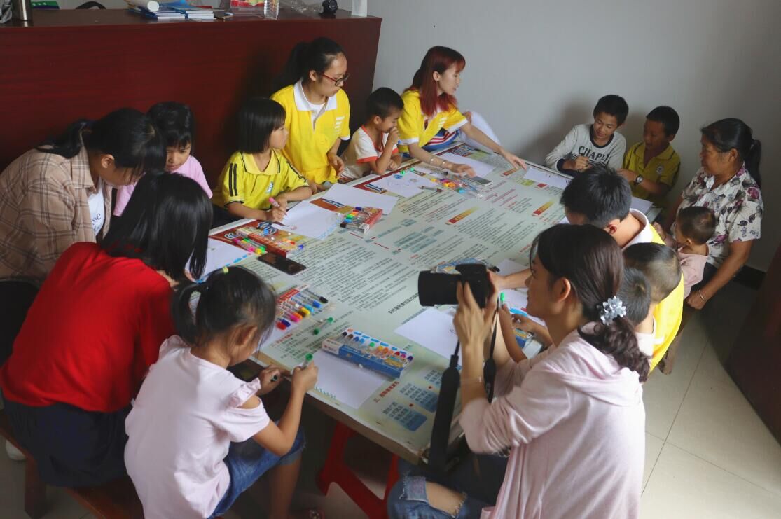 15日上午,在三树村委会,团队成员在我院团委书记姚慧老师的带领下认真布置完画室后,看到当地居民带着孩子们陆陆续续来到三树村委会,立即积极引导孩子们到画室就座并分发画纸和画笔,然后指导他们如何更好地画出他们脑海中的图画。绘画过程中,整个画室的气氛非常活跃,家长陪伴孩子们认真地画出自己心中的图画,团队成员在旁边积极指导。绘画完成后,孩子们拿着自己的作品与团队成员开心合影。随后,团队成员热情教孩子们跳拍拍操,孩子们十分兴奋地学习着。由于突然下雨,趣味运动会被迫取消,但是孩子们热情不减,团队成员给每位孩子分发书包、书本和笔盒,希望他们快乐成长、早日成才。