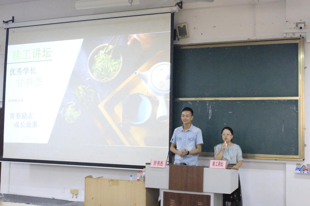 2019年9月18日下午,旅游与风景园林学院在雁山校区06105教室举行青春励志故事分享会,我院2011级优秀毕业生学长甘书杰回母校作客桂工讲坛,向学弟学妹分享他的成长励志故事,讲座由学院学工组长唐名丽主持召开。
