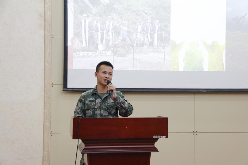 最后是退役大学生“我的军营生活”分享会环节,2018级陈焕同学从为什么参军入伍、军营生活和返校学习规划三个方面进行了分享。他谈到军营是一个纪律严明的地方,每天都有着高强度的训练任务,国家赋予他的神圣使命是他坚持住的最大理由。在两年的军旅生涯中,不仅锻炼了身体素质,更多的是精神境界和严以律己的良好习惯。
