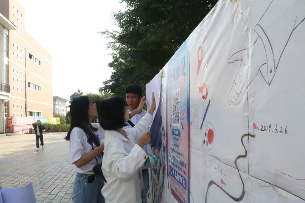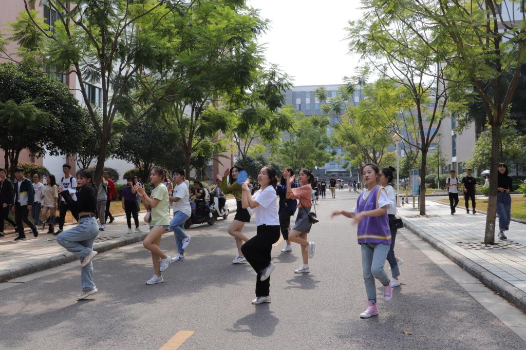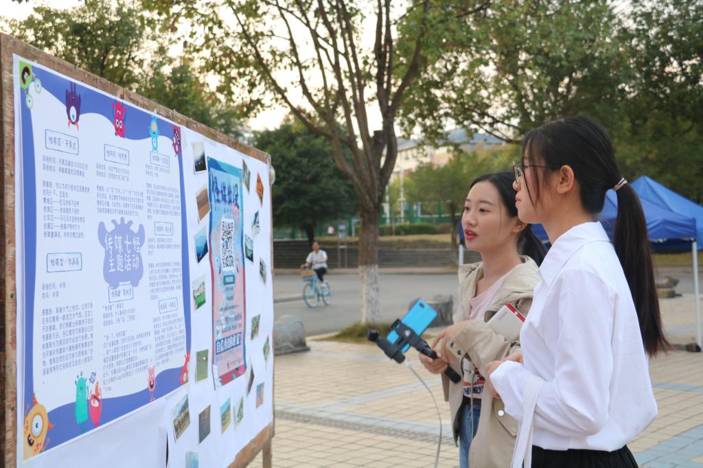 10月21日,广告学、传播学同学们为第二天晚上的开幕式做了宣传预热活动,其中在一号、二号食堂设点宣传,宣传方式为送集赞礼品、派发传单、展示主题板报、播放宣传片等。同时广告学、传播学学生还特别策划了两场快闪活动,活动形式均为舞蹈,第一场在中午放学时段,活动路线为雅诺餐厅到教三栋、教四栋间的小路间,