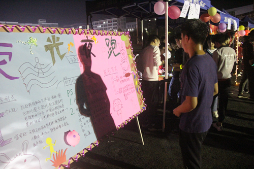 活动伊始,主持人邀请舒强老师发言。舒强老师首先向同学们强调了举办此次活动的主要目的和重要意义,并表示希望同学们在遵守活动规则同时要注意人身和财产安全。随后,在两位老师的领跑下本次荧光夜跑活动正式拉开序幕。据悉,同学们每跑完一圈,需要前往与自己编号所对应的帐篷进行圈数登记并领取荧光棒,同时,每一位同学跑完一圈,扬帆社将从扬帆基金中拿出0.3元用于公益。当运动者们达一定的圈数时,将会获得对应的第二课堂学分和精美灯光头饰。活动期间,易班工作站通过轻应用进行抽奖,并为获奖的同学送上精美礼品。