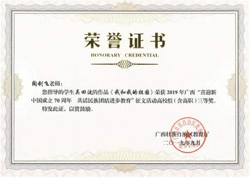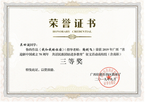 日前,广西壮族自治区教育厅开展的“喜迎新中国成立 70 周年 共话民族团结进步教育”征文活动已顺利结束,经过专家评审、教育厅审核,获奖名单已公布。太阳集团城网站2017地质学17-1班吴田波同学参赛作品《我和我的祖国》喜获三等奖,作品由陶剑飞老师指导完成。