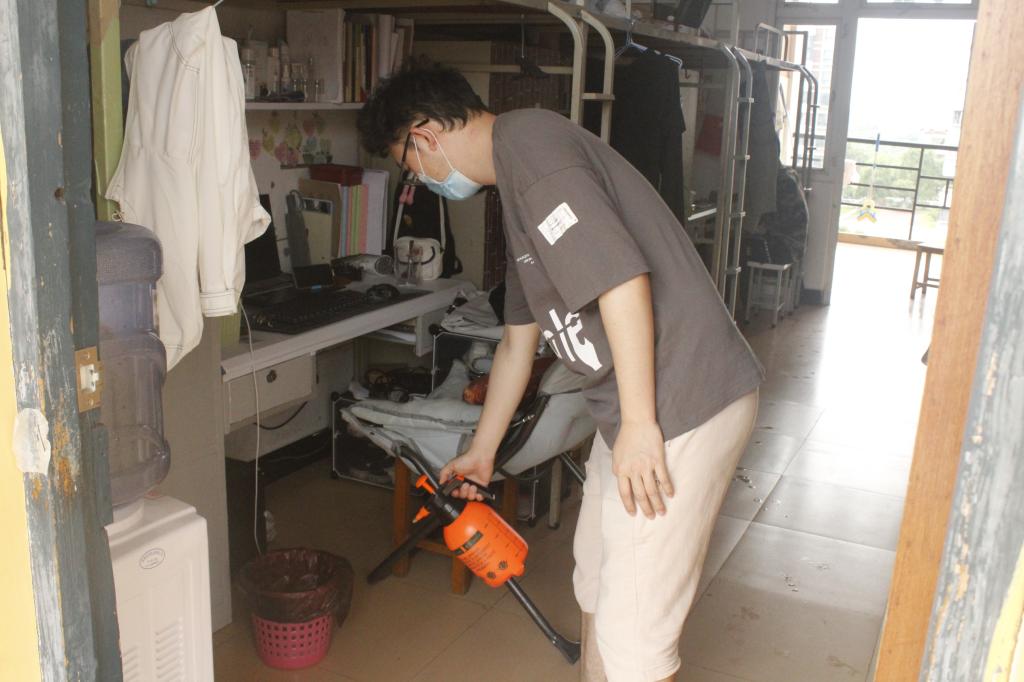 进入宿舍后,大家首先向同学们宣讲此次消毒的目的和意义,并提醒同学们要勤开窗通风、注意宿舍卫生,紧接着开始对宿舍内的墙角、阳台、卫生间、桌下等进行全方位、多角度消毒,尽量做到不留死角。此外,还对各层走廊、大厅、楼道等人流量大的公共区域进行消毒。在大家共同的努力下,整个消毒工作有条不紊的进行。