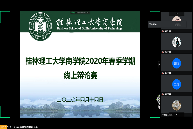 为了丰富同学们单一的宅家生活,展现出疫情期间当代大学生朝气与活力,商学院于4月14日下午举办了2020年商学院春季学期线上辩论赛。外国语学院辩论队队长金奕仰、理学院辩论队技术指导陈钦毅、商学院辩论队副队长魏彦旭担任比赛评委。本次辩论赛通过腾讯会议举办,商学院部分同学观看了比赛。