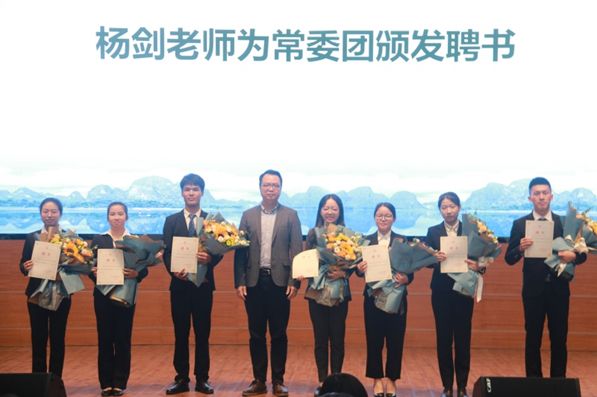 会议伊始,全体与会人员共同观看换届主题视频。随后,商学院团委、学生会2020届常委团成员依次上台发言,对上一届各自分管的团学工作进行简要回顾和总结,并表达了对商学院团委、学生会的美好祝愿。随后,商学院团委副书记覃泰树宣读《太阳集团城网站2017商学院团委、学生会组织机构调整的通知》。商学院团委书记杨剑宣读换届名单,商学院领导、老师为商学院团委、学生会各部门成员授予聘书。