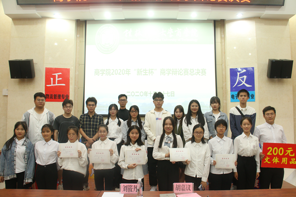 为提升2020级新生的思辨能力,推进商学院校园文化建设,商学院举行了2020级“新生杯”商学期辩论赛。经过层层激烈比拼,物流管理专业代表队、电子商务专业代表队脱颖而出,辩论赛决赛于10月27日下午在雁山校区萃华楼报告厅举行。商学院学生会指导老师刘筱丹、2020级辅导员胡嘉议出席本次比赛,18级辩论协会会长陈钦毅、17级校辩论队主力黄智鸿、18级校辩论队主力温炜担任比赛评委。