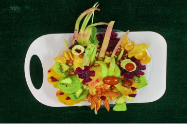 在比赛现场,参赛选手们在有限的食材和时间内,充分发挥想象力,共同设计冷食拼盘,展示出了较强的动手能力,色彩缤纷的水果在同学们的手上变成了“艺术品”,在拼盘作品完成后每组参赛选手对作品进行了内涵陈述。最后,魏俊儒老师就本次比赛进行了总结评价,