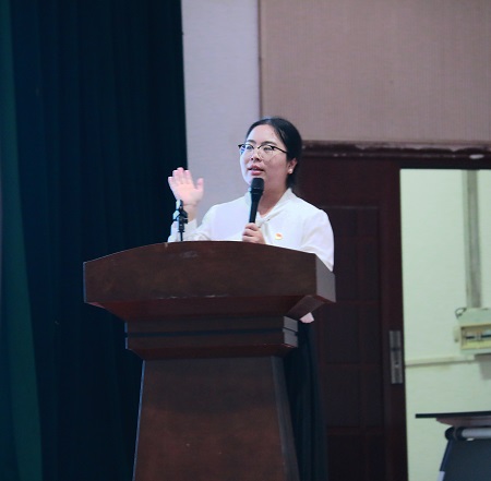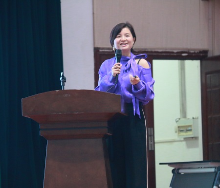 随后学院教师代表徐云老师,代表全院全体教师对2020级新生的加入表示欢迎,她在发言中表示,希望同学们懂得感恩、珍惜当下,只争朝夕、不负韶华,在桂工这个多彩的校园里描绘出属于自己的美好青春画卷,成为最优秀的自己。